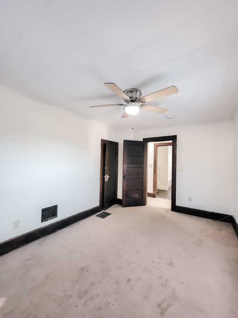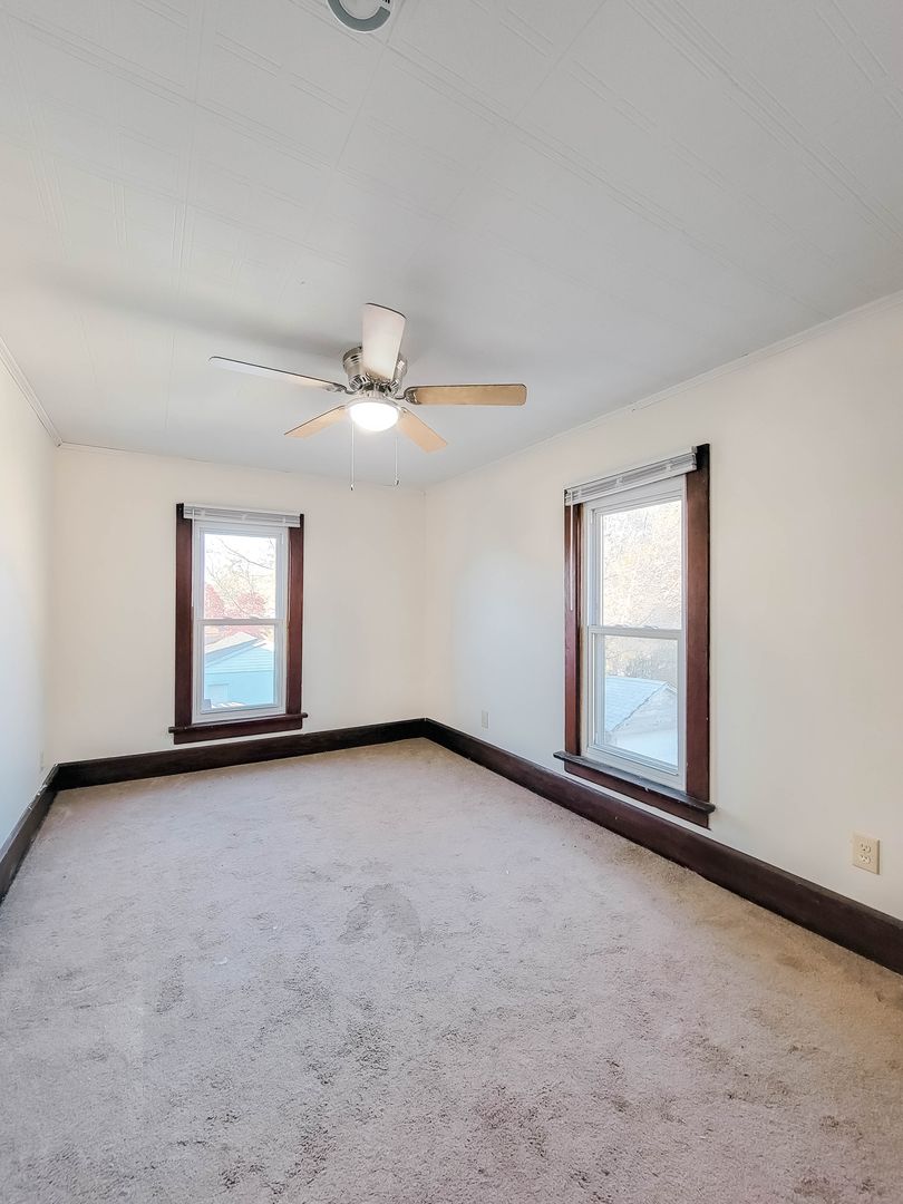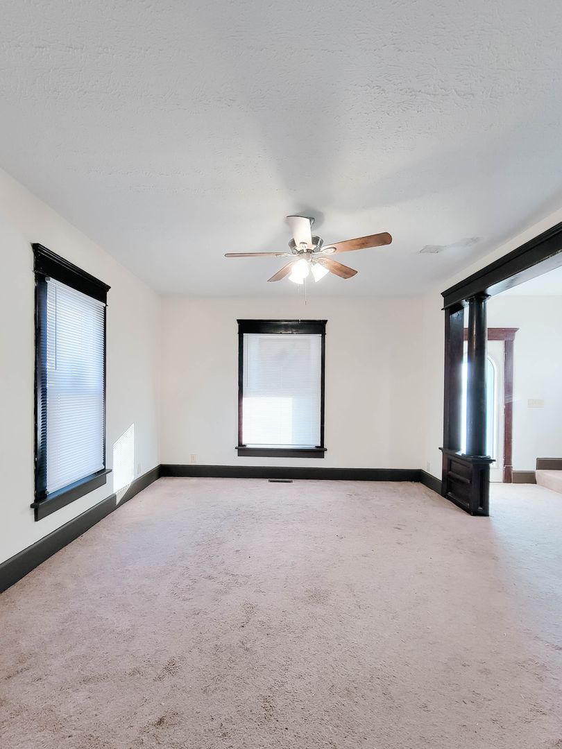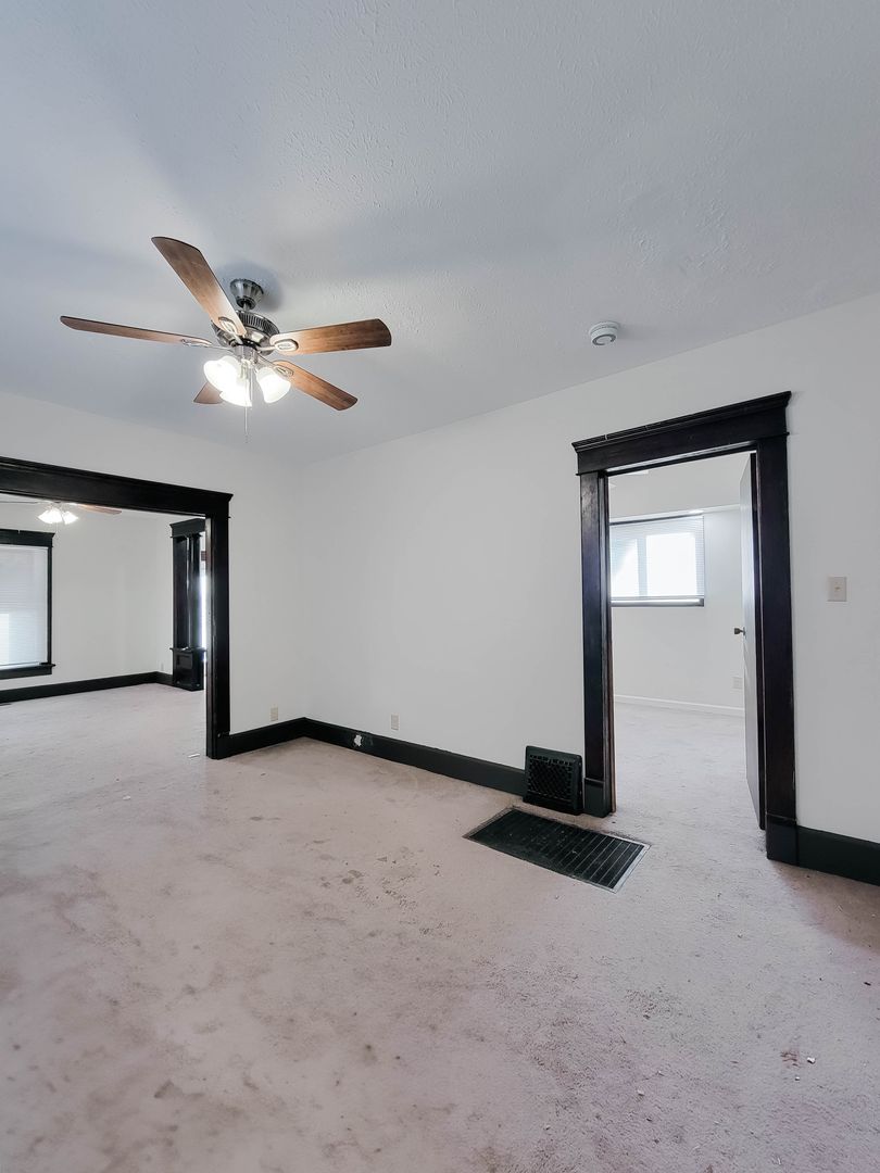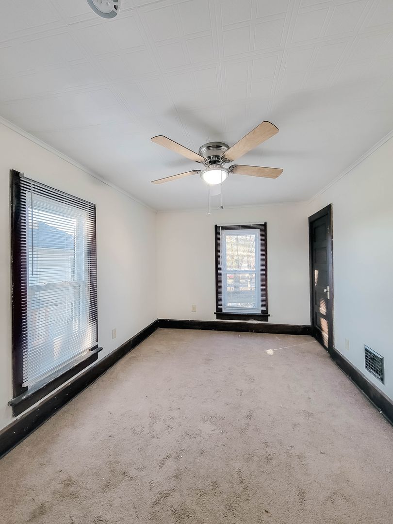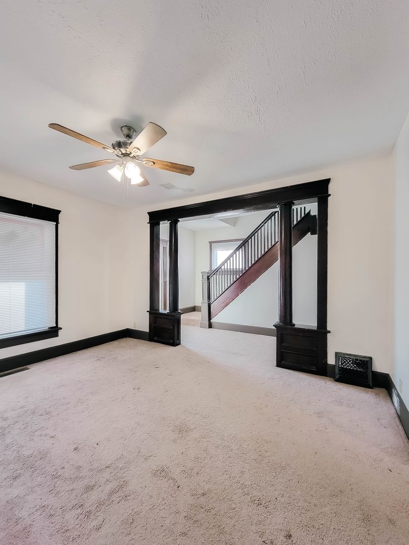 This home opens up to the foyer with the staircase to the second floor on the left and open entry into the living room on the right. The living room has high ceilings, carpet, and fresh paint that extend throughout. The living room opens to the dining room with a bench seat beneath the window and access to the first floor bedroom. The first bedroom has a large closet and additional shelving with double door access to the basement. The basement has fresh paint and is great for rough storage. Back off of the dining room is a hallway with the last two rooms on the first floor. There is a full bathroom with laundry area with washer dryer hookups (no washer or dryer included). The other room is a great kitchen with lots of counterspace, new stainless steel appliances, plenty of cabinets, and eat-in dining space. On the second floor there are three more bedrooms and a full bathroom with storage closet.