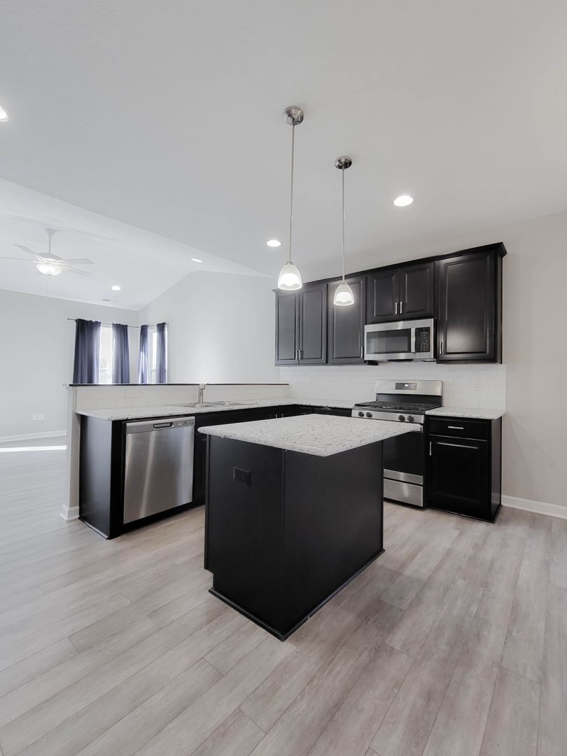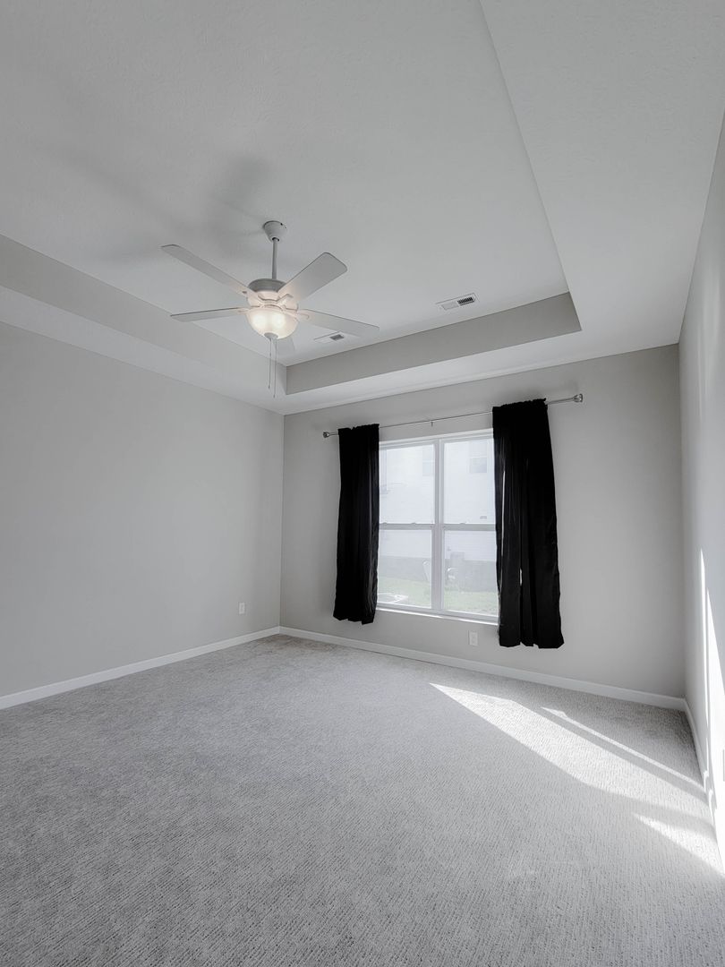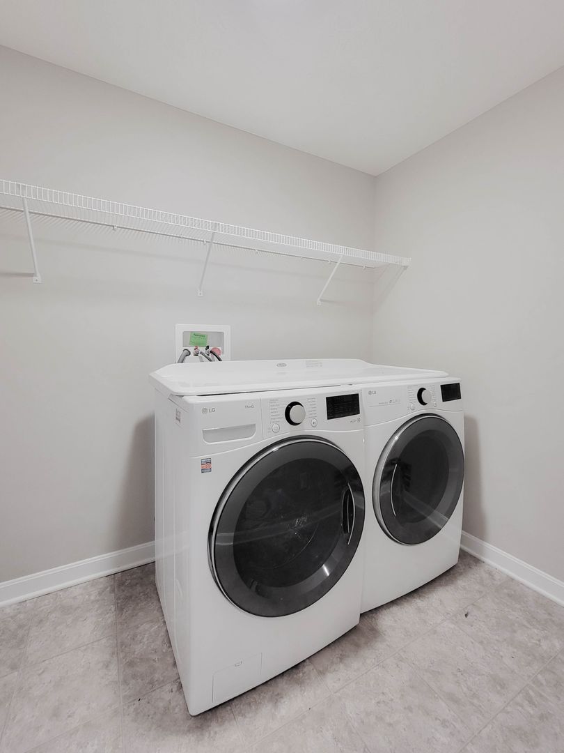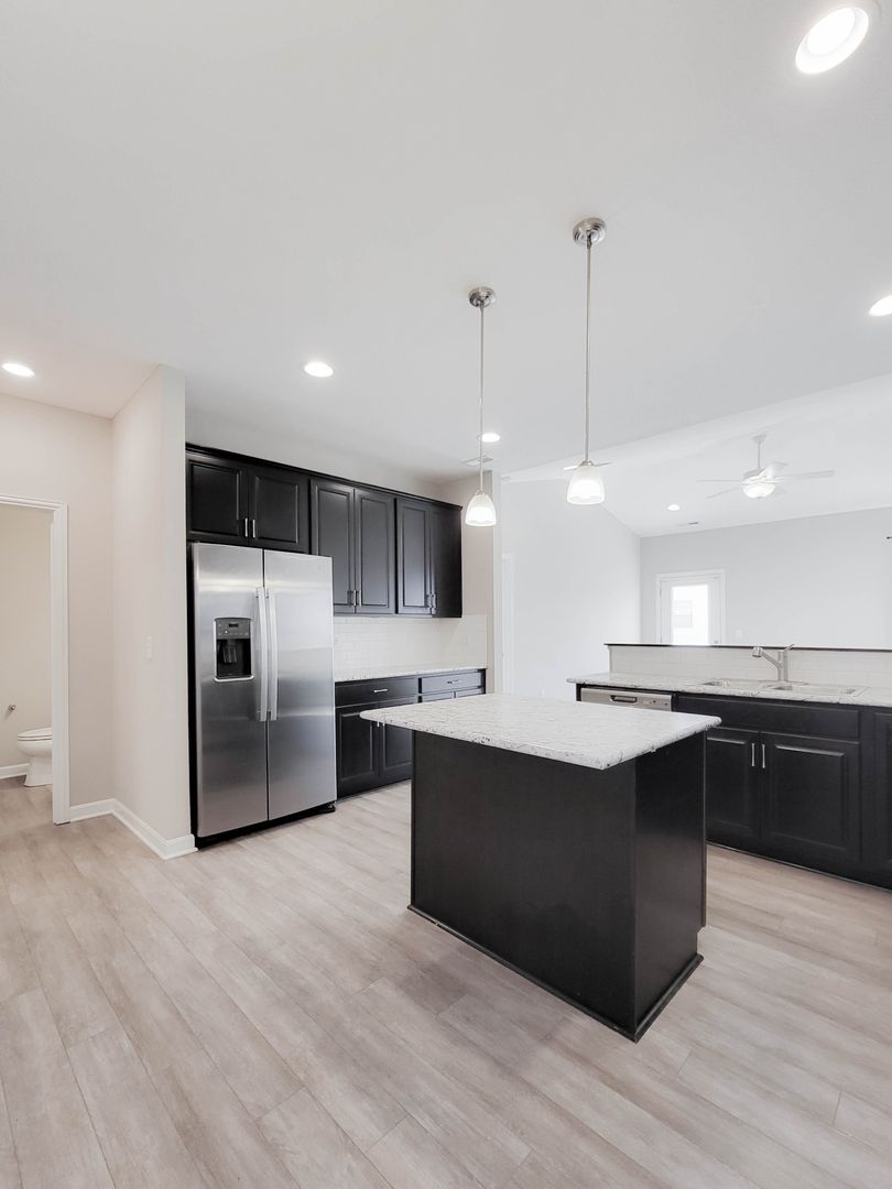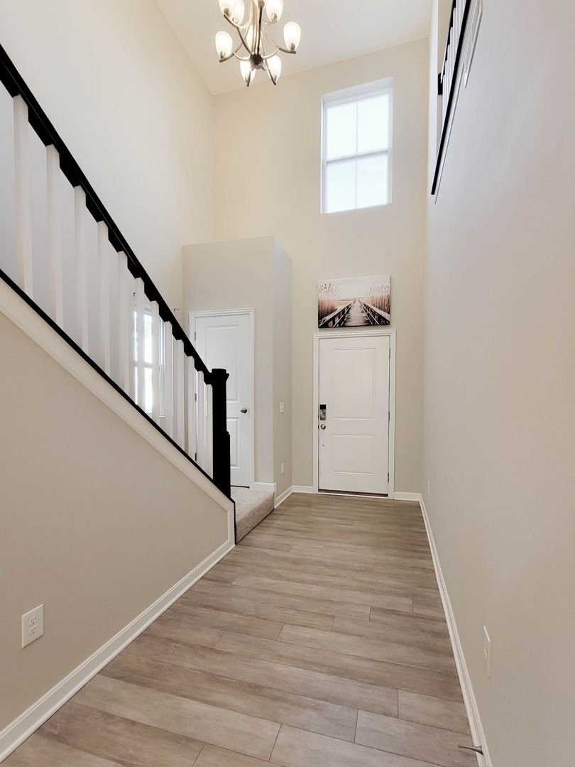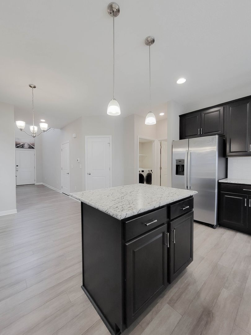 Ahead is the central point of this home, the kitchen. It has an open concept for eat in dining or bar seating at the island. There is a walk-in pantry, stainless steel appliances, great counterspace, and soft close cabinets. Next to the kitchen is a half bathroom and a separate laundry room with washer and dryer included. Open to the kitchen is the living room at the back of the home over looing the pond. It has large windows, a vaulted ceiling, and access to the back patio. Off of the living room is the first floor bedroom. This bedroom has a recessed tray ceiling, en-suite bathroom with a shower, double vanity, and walk in closet. Back in the entry area and open the staircase is a large open flex area great for a second living space or open office. The three other bedrooms are on this floor as well as another full bathroom with a tub and shower combo.
