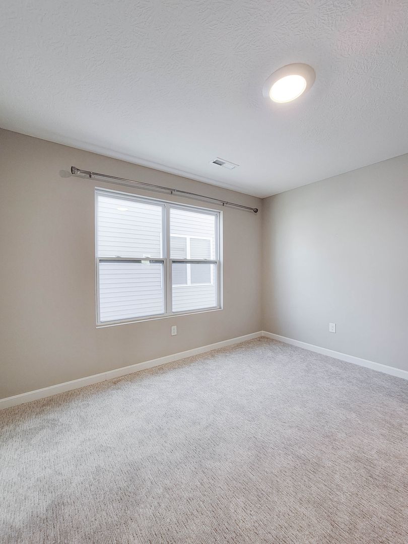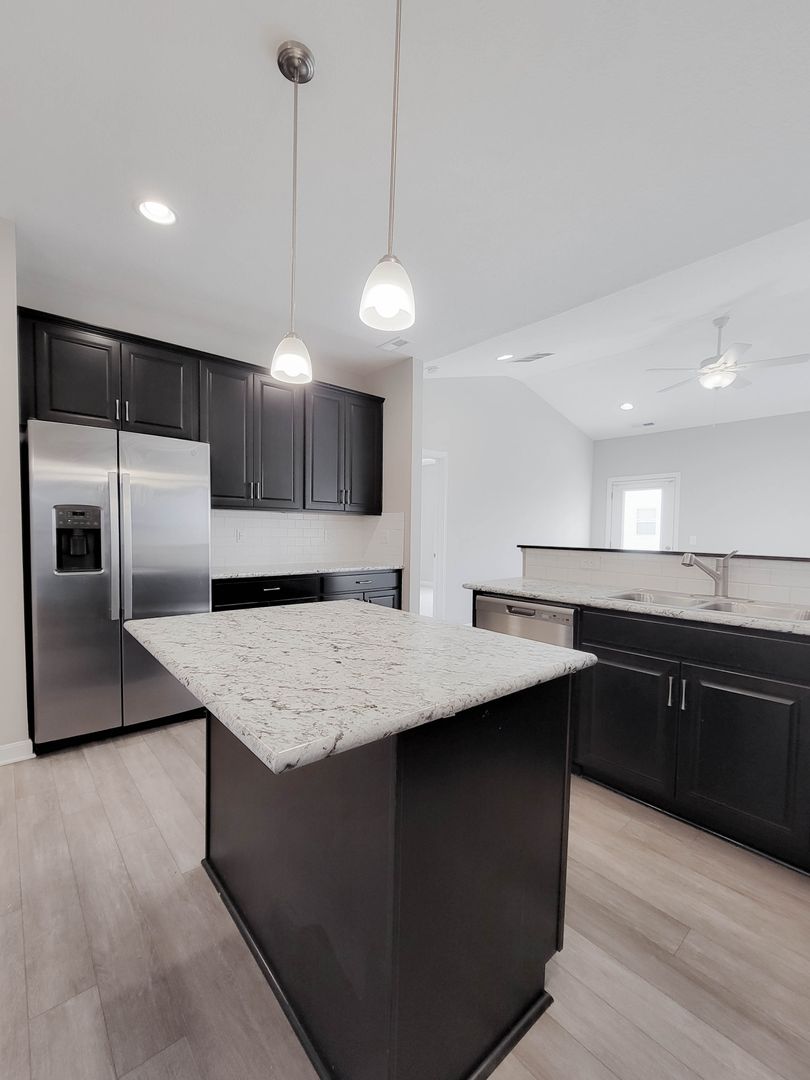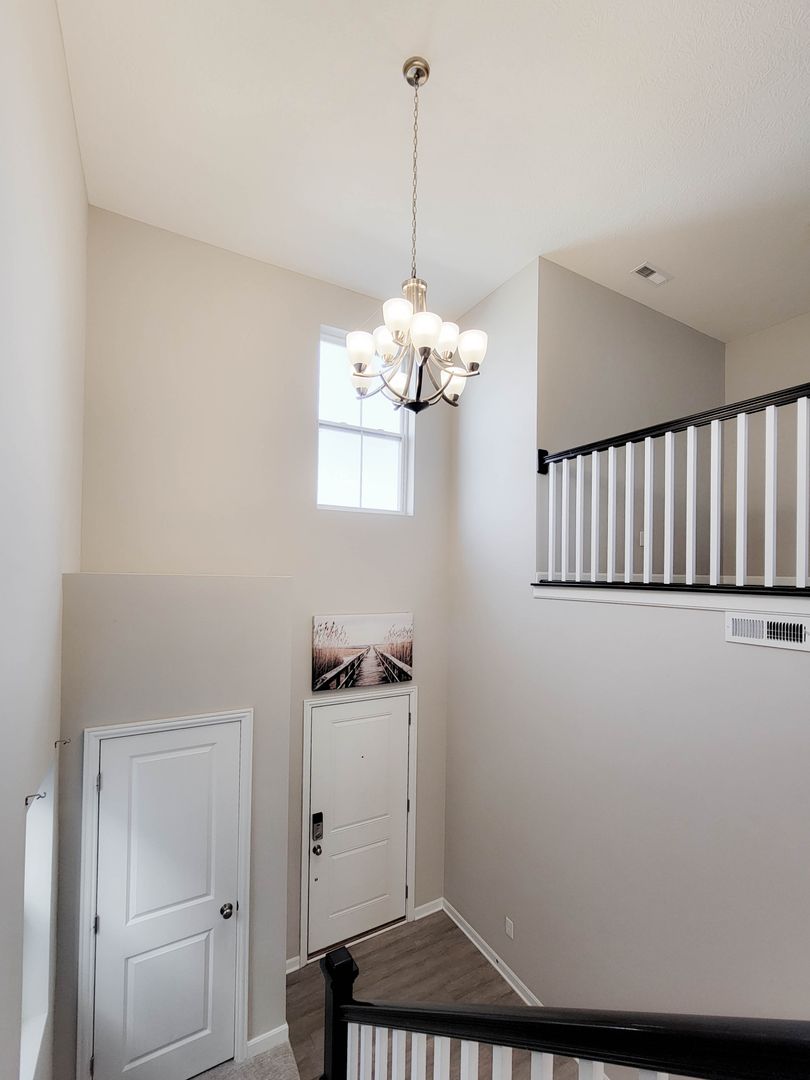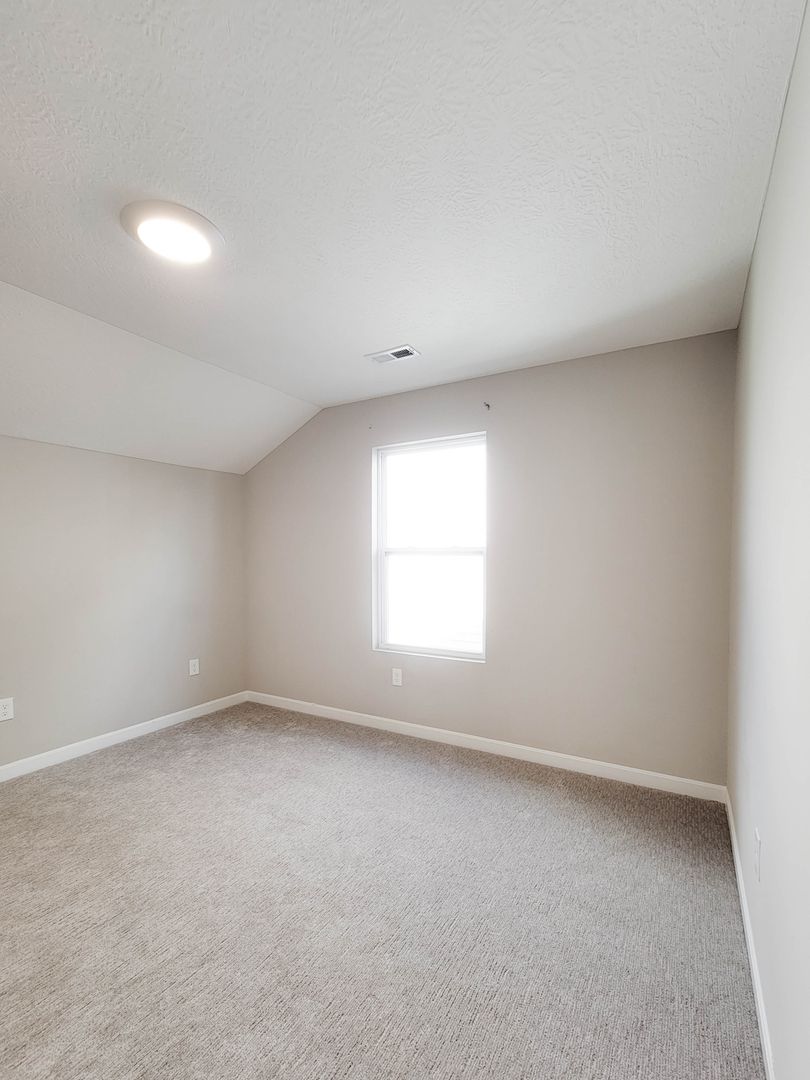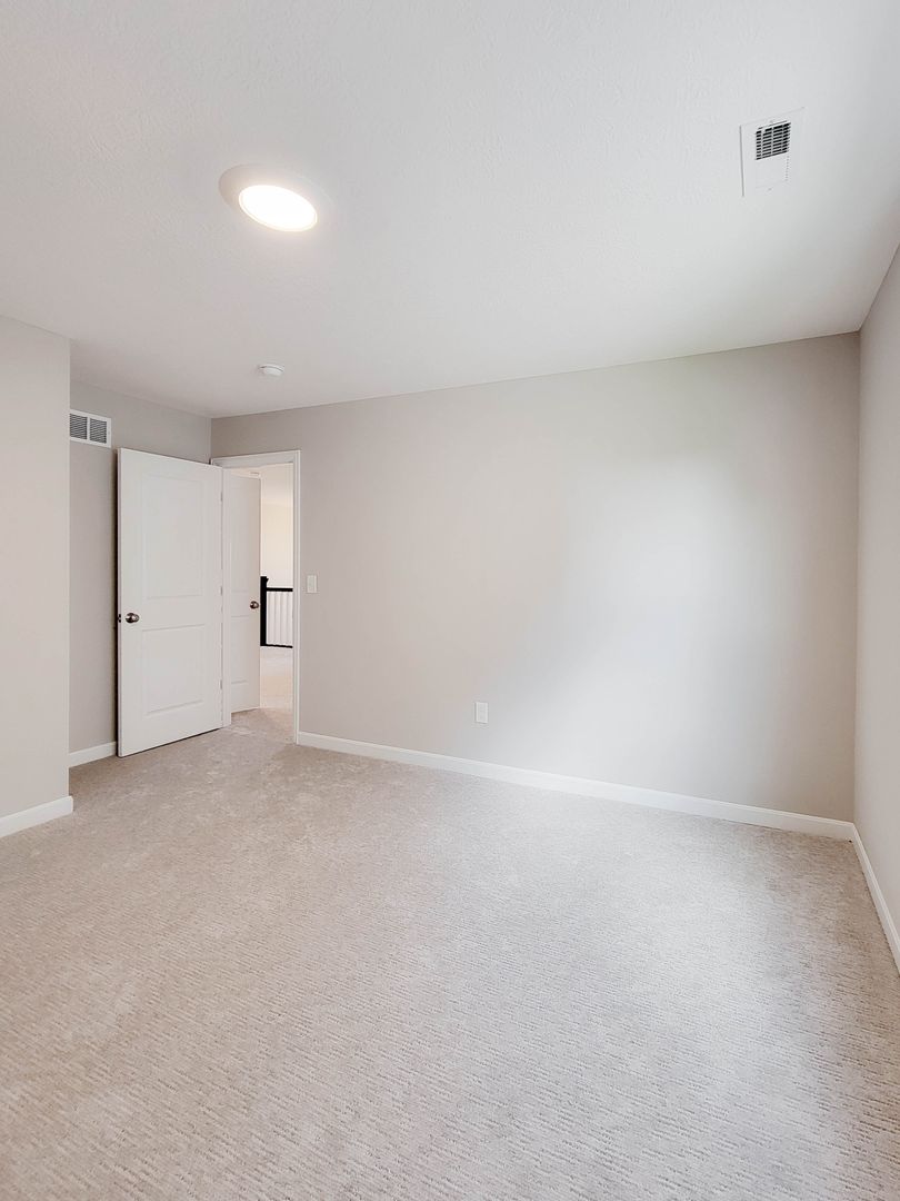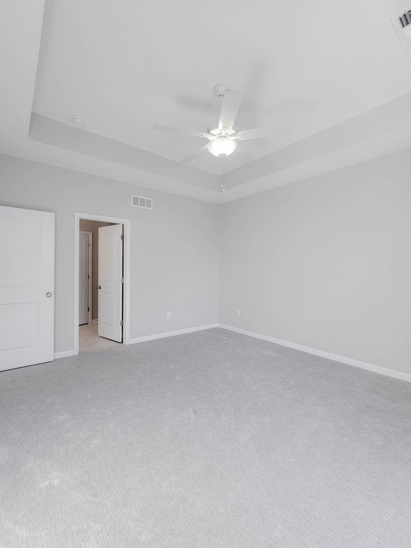 Ahead is the central point of this home, the kitchen. It has an open concept for eat in dining or bar seating at the island. There is a walk-in pantry, stainless steel appliances, great counterspace, and soft close cabinets. Next to the kitchen is a half bathroom and a separate laundry room with washer and dryer included. Open to the kitchen is the living room at the back of the home over looing the pond. It has large windows, a vaulted ceiling, and access to the back patio. Off of the living room is the first floor bedroom. This bedroom has a recessed tray ceiling, en-suite bathroom with a shower, double vanity, and walk in closet. Back in the entry area and open the staircase is a large open flex area great for a second living space or open office. The three other bedrooms are on this floor as well as another full bathroom with a tub and shower combo.