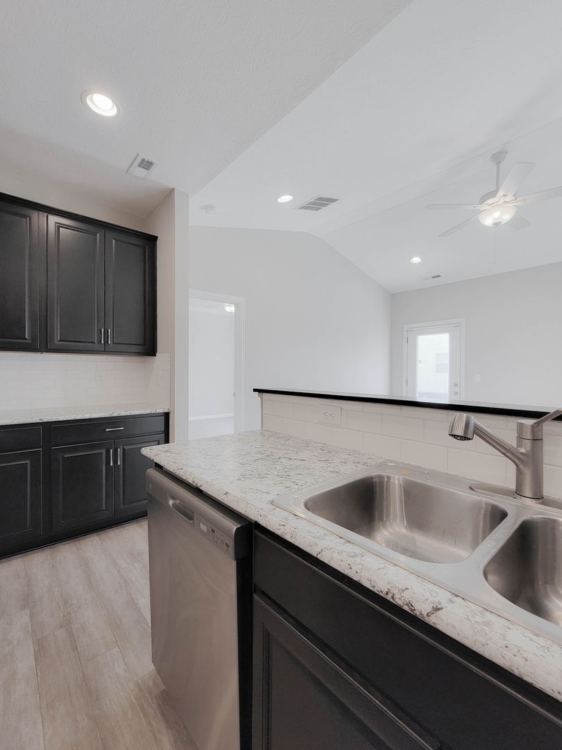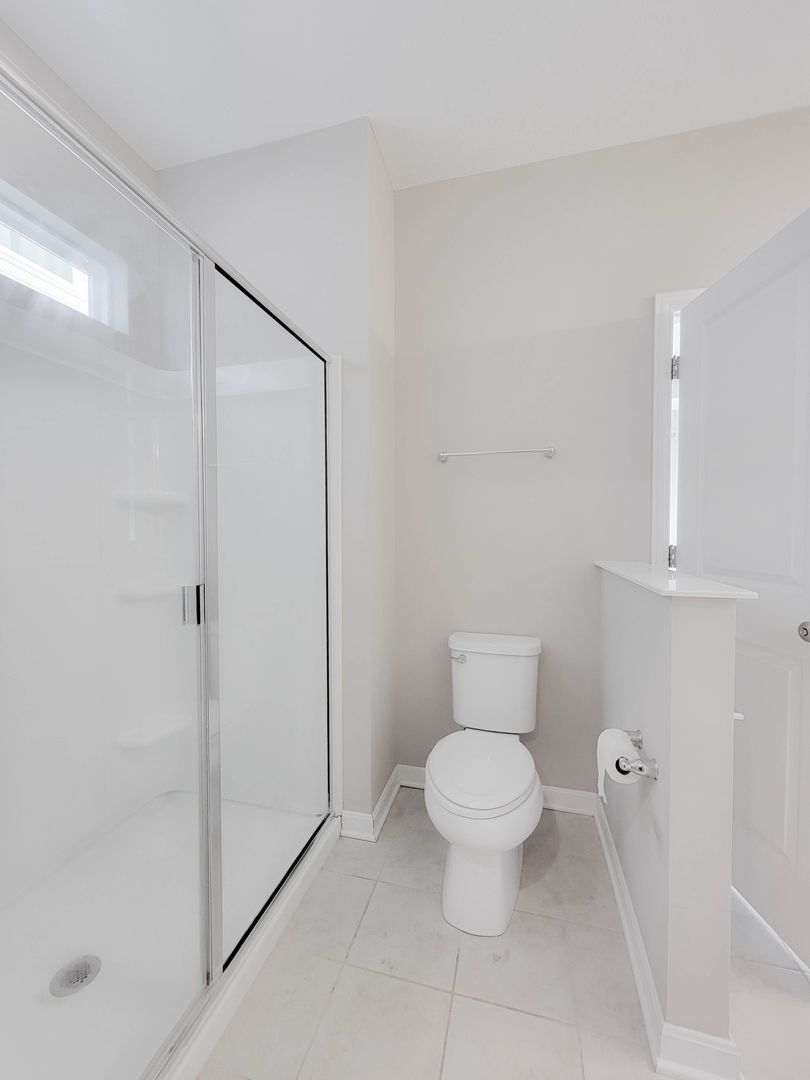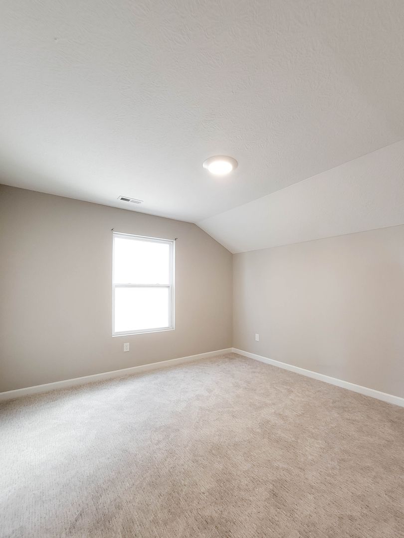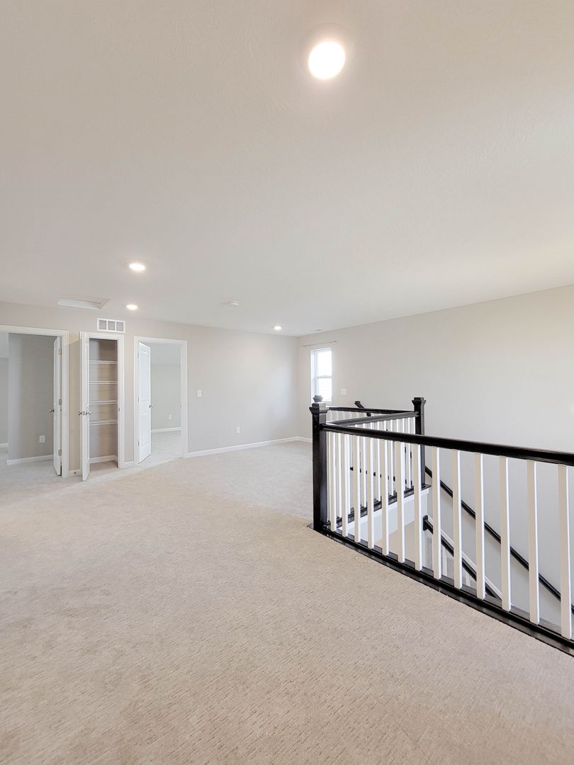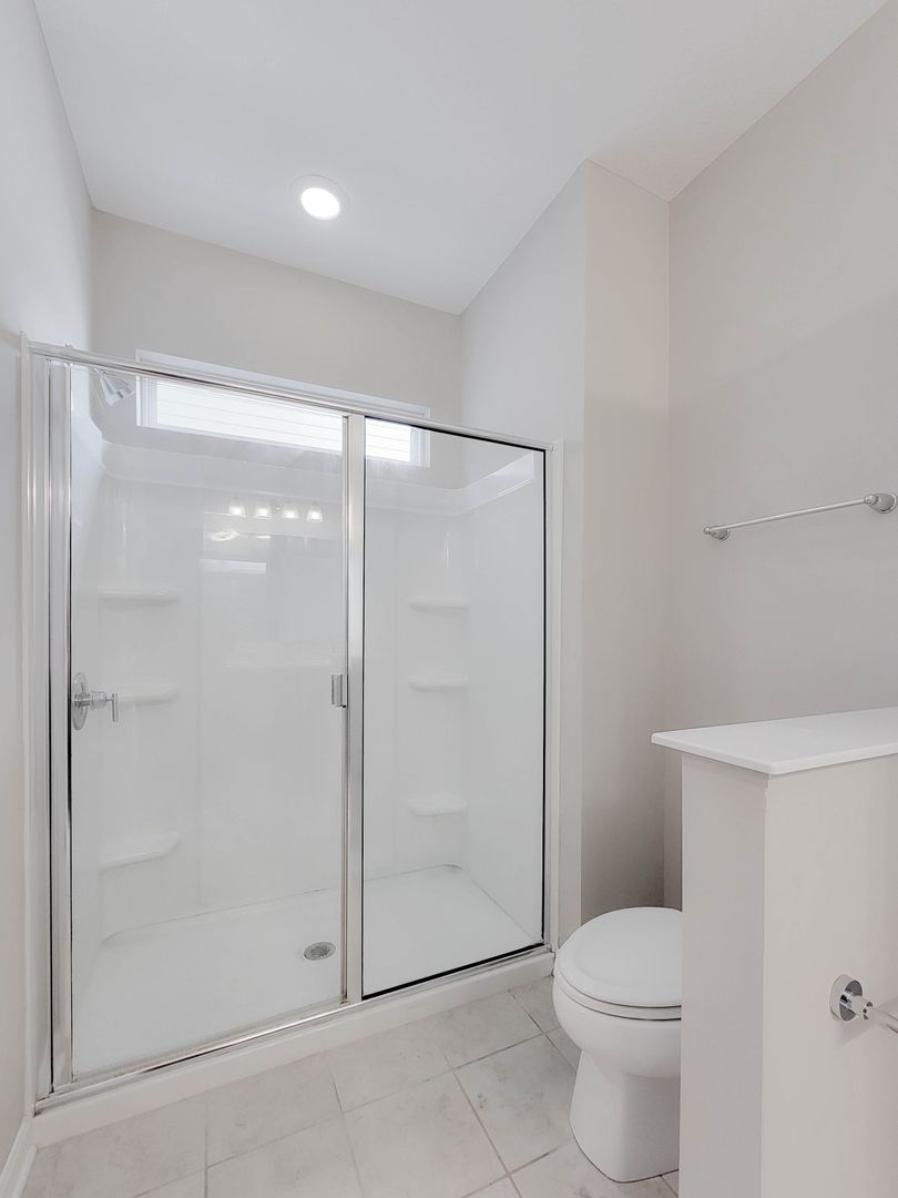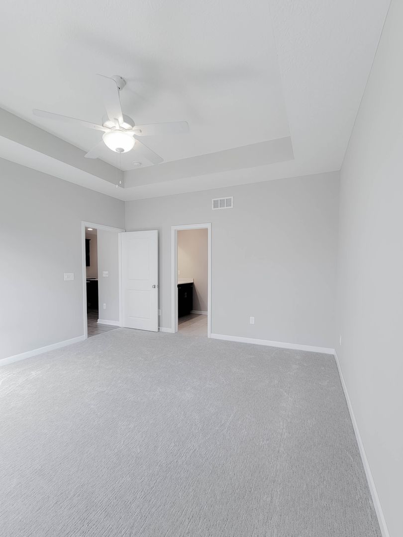 Ahead is the central point of this home, the kitchen. It has an open concept for eat in dining or bar seating at the island. There is a walk-in pantry, stainless steel appliances, great counterspace, and soft close cabinets. Next to the kitchen is a half bathroom and a separate laundry room with washer and dryer included. Open to the kitchen is the living room at the back of the home over looing the pond. It has large windows, a vaulted ceiling, and access to the back patio. Off of the living room is the first floor bedroom. This bedroom has a recessed tray ceiling, en-suite bathroom with a shower, double vanity, and walk in closet. Back in the entry area and open the staircase is a large open flex area great for a second living space or open office. The three other bedrooms are on this floor as well as another full bathroom with a tub and shower combo.