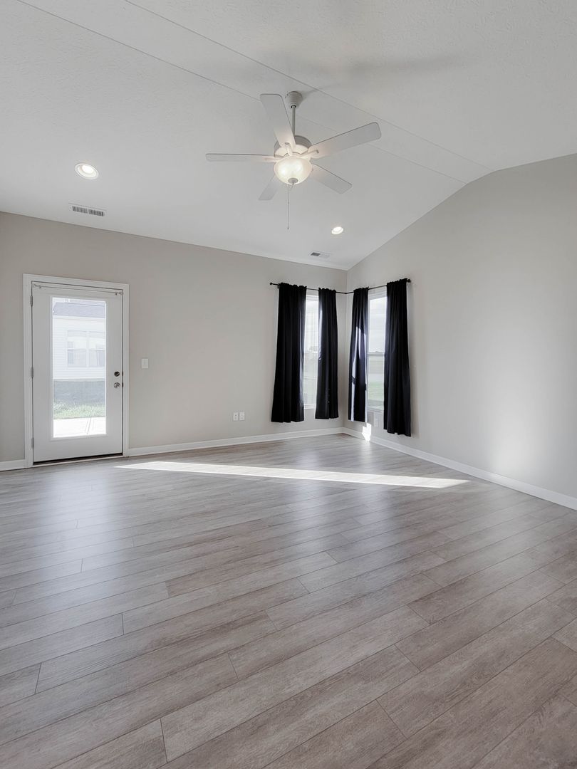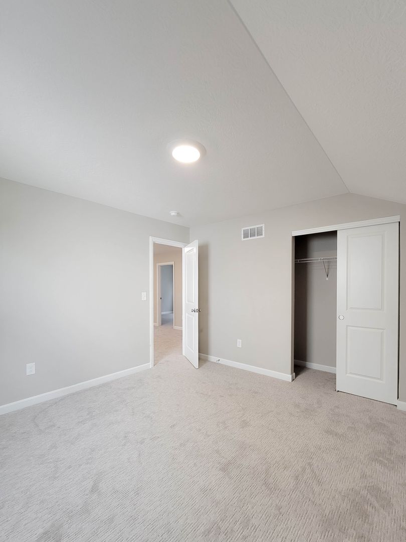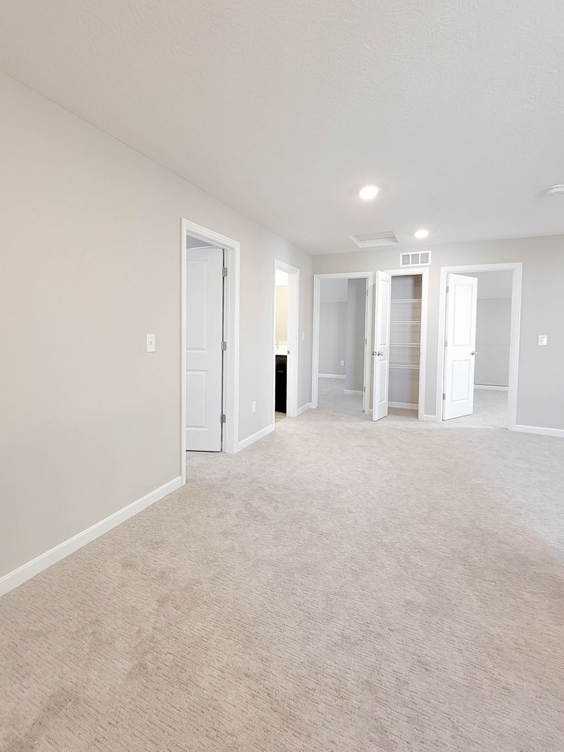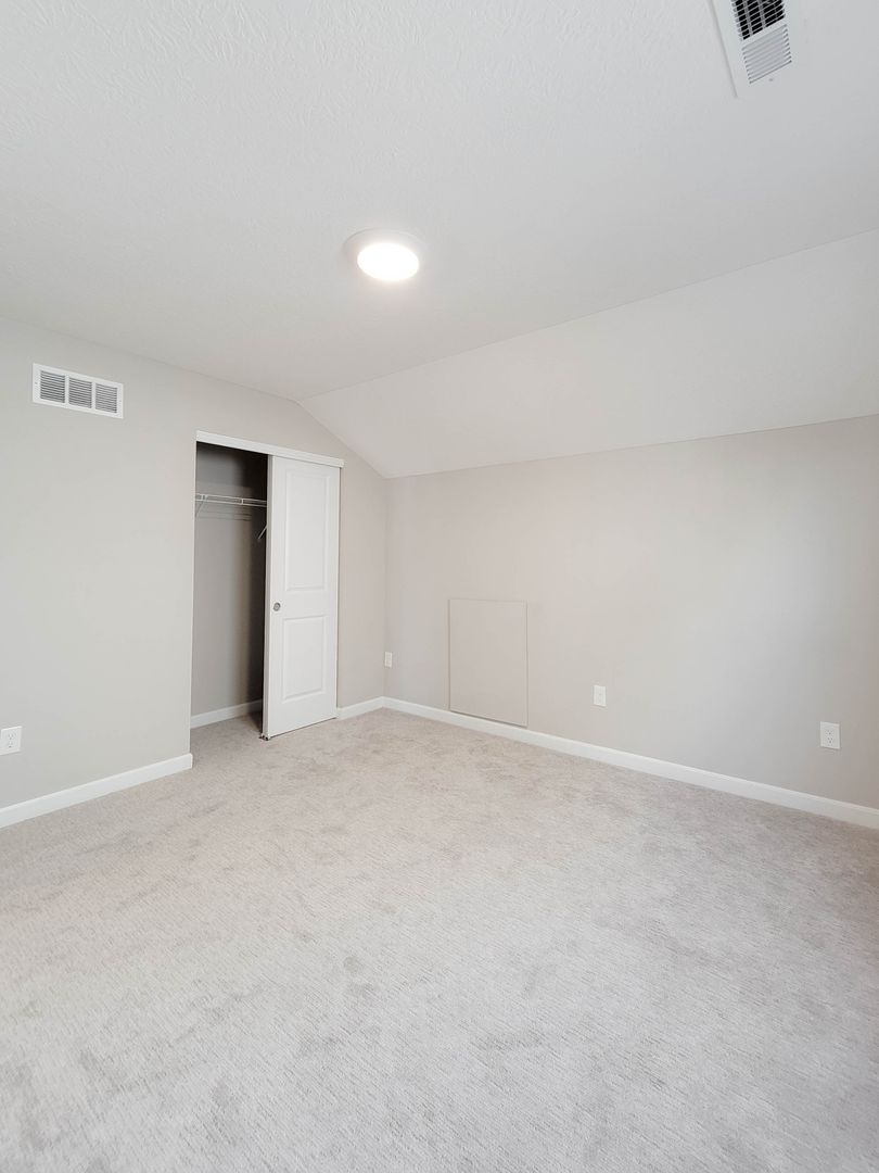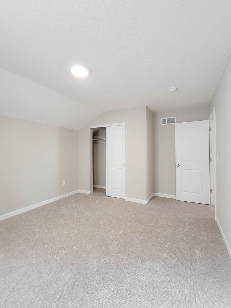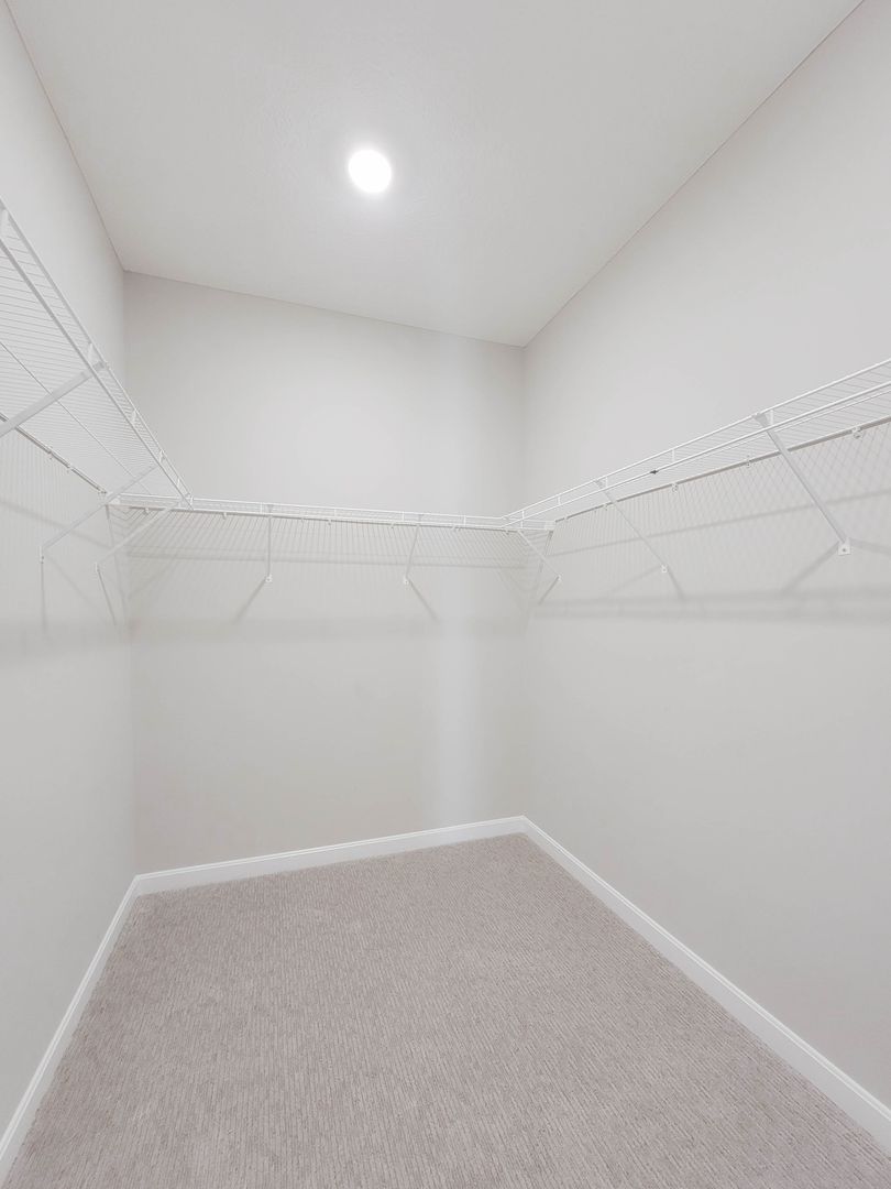 Ahead is the central point of this home, the kitchen. It has an open concept for eat in dining or bar seating at the island. There is a walk-in pantry, stainless steel appliances, great counterspace, and soft close cabinets. Next to the kitchen is a half bathroom and a separate laundry room with washer and dryer included. Open to the kitchen is the living room at the back of the home over looing the pond. It has large windows, a vaulted ceiling, and access to the back patio. Off of the living room is the first floor bedroom. This bedroom has a recessed tray ceiling, en-suite bathroom with a shower, double vanity, and walk in closet. Back in the entry area and open the staircase is a large open flex area great for a second living space or open office. The three other bedrooms are on this floor as well as another full bathroom with a tub and shower combo.